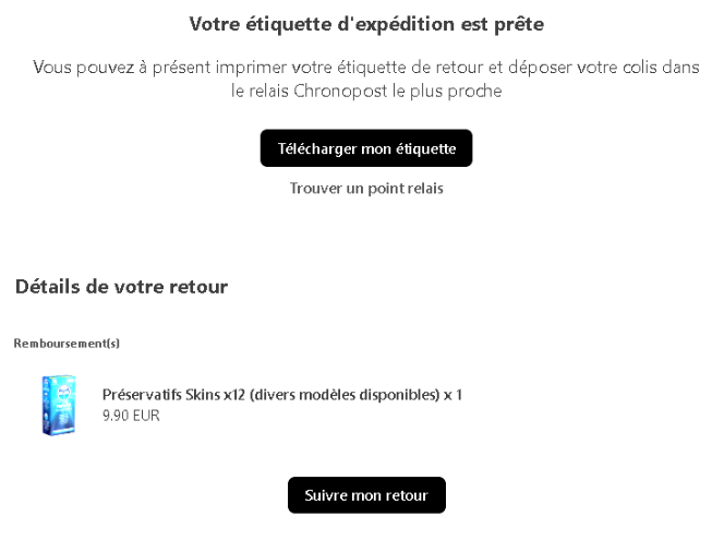 Une fois le retour validé par notre service client vous recevez un second mail avec la possibilité de télécharger votre étiquette de retour et de trouver un point relais pour déposer le colis