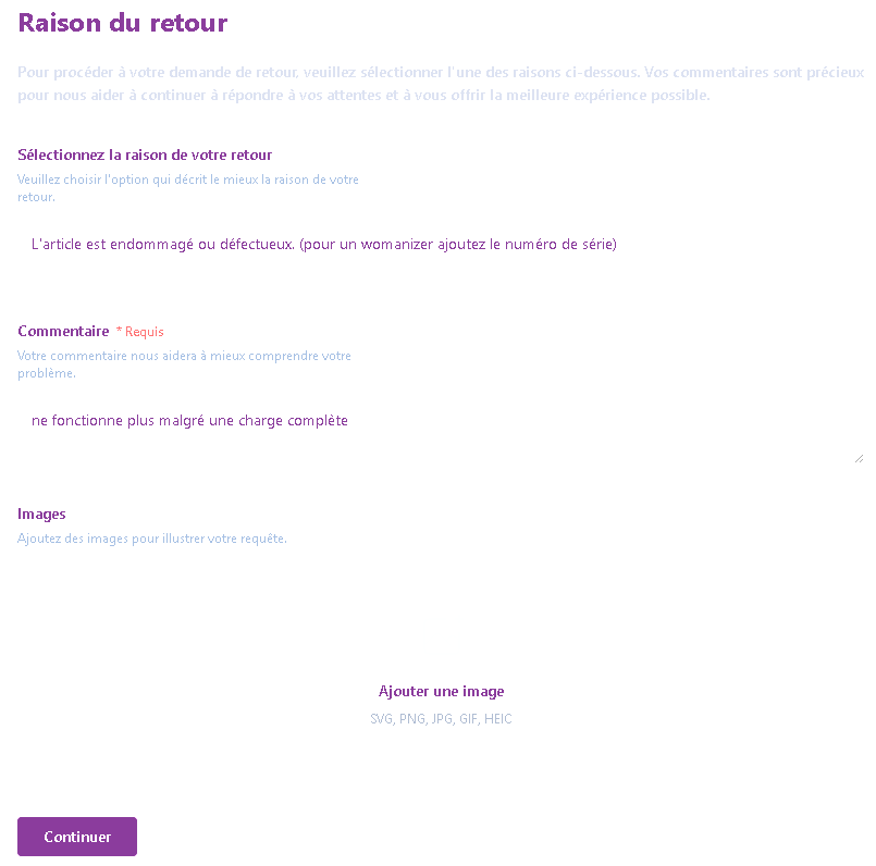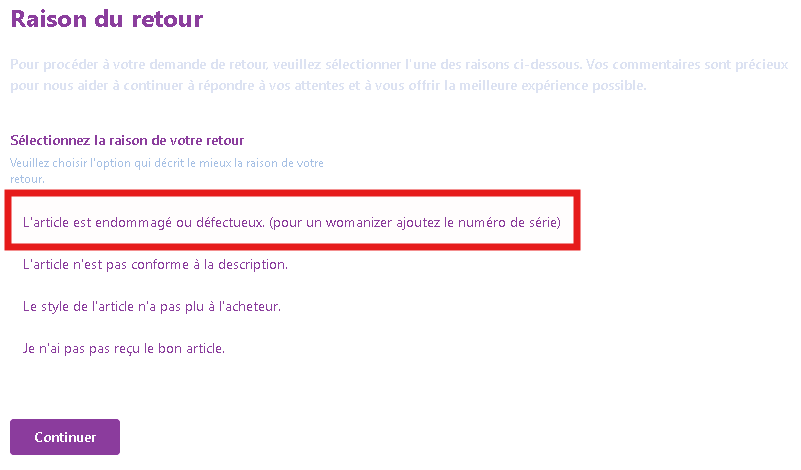 Si plusieurs articles sont à retourner, sélectionner le prochain et suivez la même procédure