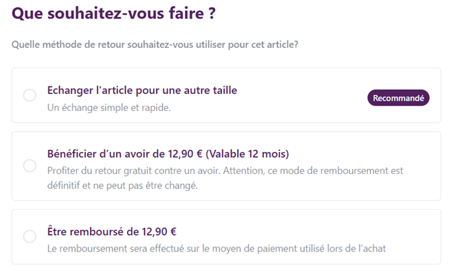 Pour un échange vous recevrez une confirmation de commande pour l'article de remplacement